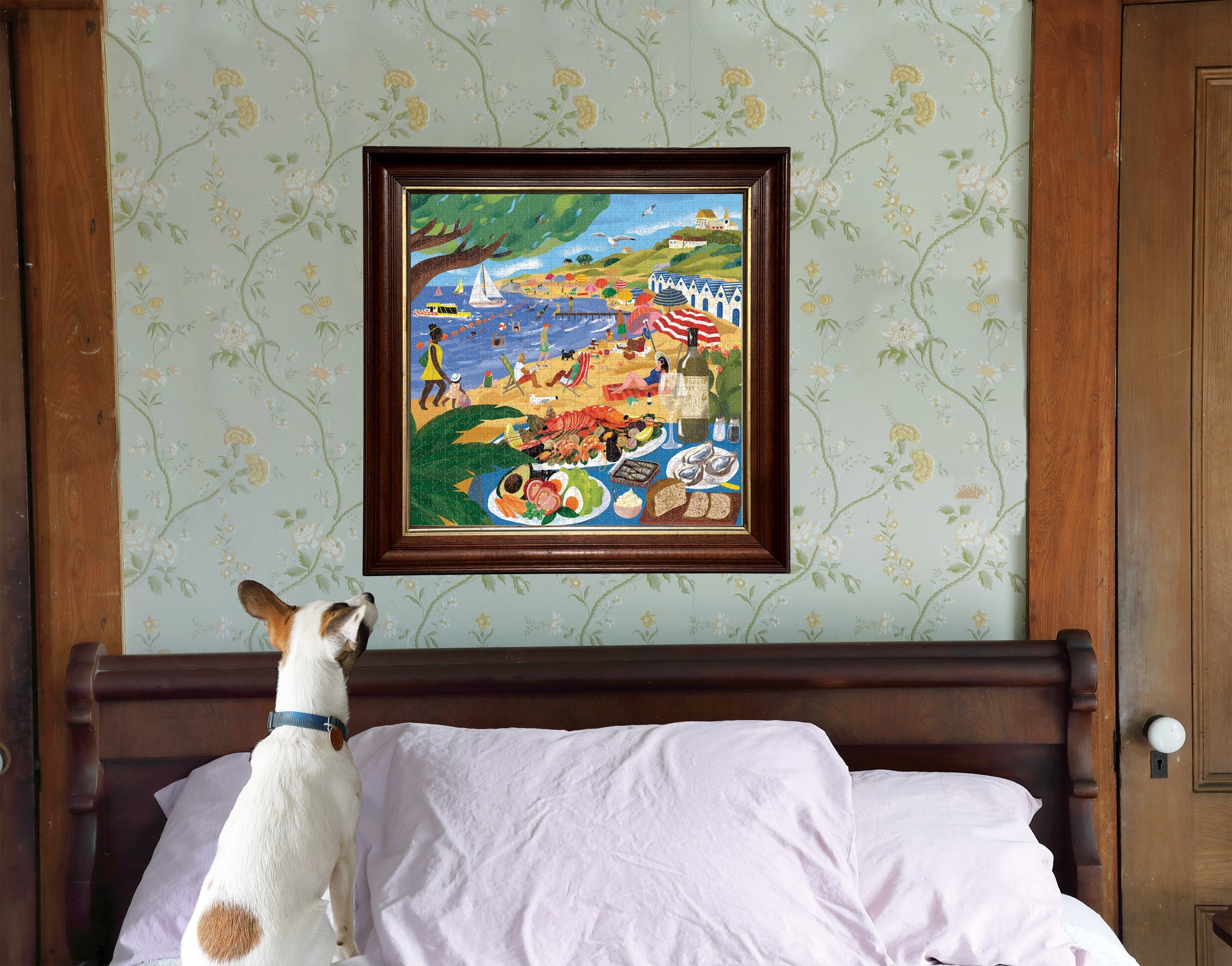 Beach Umbrellas 1000 piece puzzle gives an artistic nod to the graphic travel posters of an earlier time. This puzzle scene embodies a perfect seaside holiday: you can almost feel the sand between your toes and smell the ocean air. Details include colorful beach umbrellas, a green countryside, water activities and a bounty of fresh food with the day’s catch in front of you. To be followed, of course, by a long siesta! Illustrated by Lucia Calfapietra.