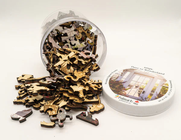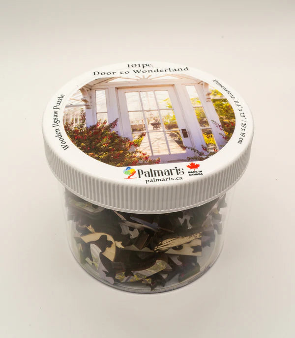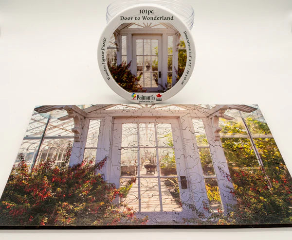 Back Side: Turning the puzzle over reveals the Wonderland in all its glory. A majestic cat’s head peers through the foliage, overseeing a land where felines bask in the sun and fairies dance in the breeze. Central to this enchanting scene is the Door to Wonderland, seen from within, offering glimpses of the greenhouse through its quaint windows. The presence of a sorcerer and more mystical beings adds depth and intrigue, inviting you to explore every inch of this fantastical landscape.