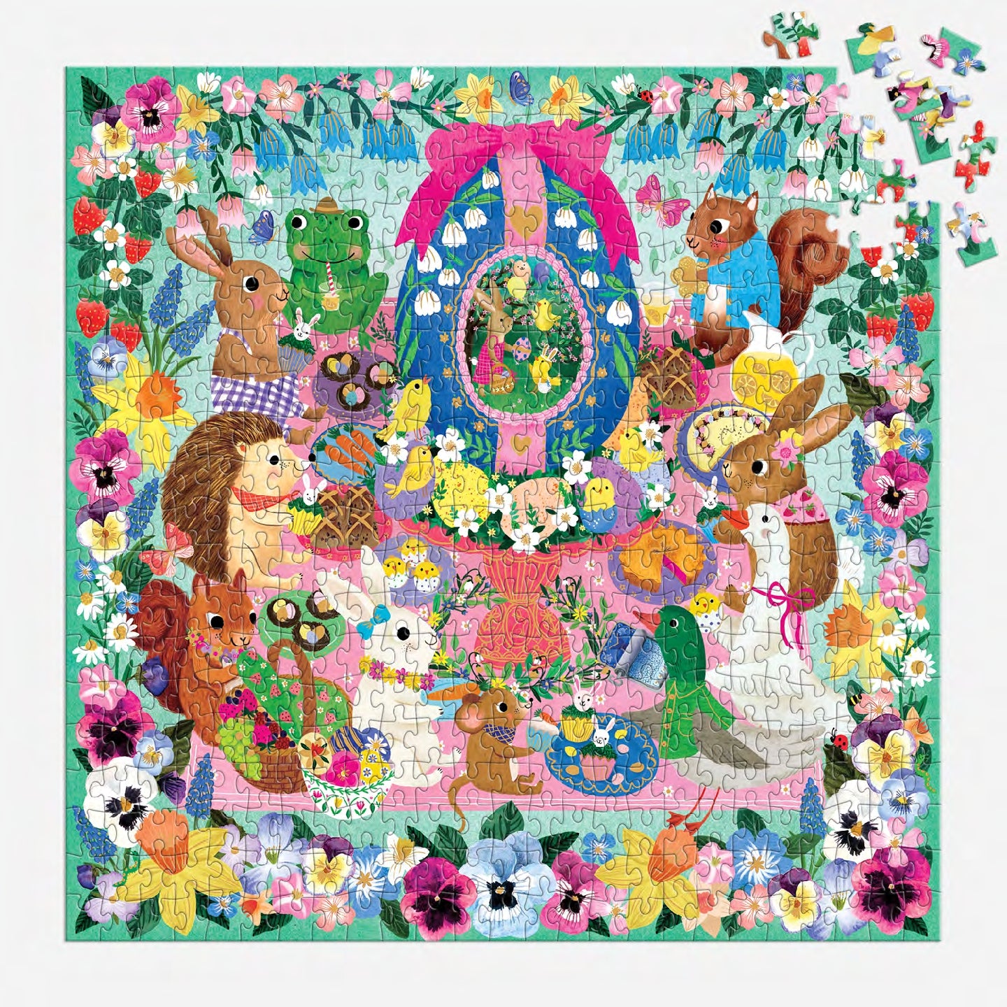 Gather the whole crew for an egg-stra special puzzle! This 500-piece foil family puzzle by Rebecca Jones sparkles with delightful charm and whimsical detail. The shimmering foil accents catch the light as you piece together a heartwarming scene that's perfect for cozy family time. With a bright floral border and a feast of treats, you'll enjoy piecing together the party of celebrating woodland animals. It's perfect for an Easter gathering or as a spring time family activity. Frame your finished masterpiece and let its cheerful brilliance brighten your space—a radiant reminder of quality time spent together!