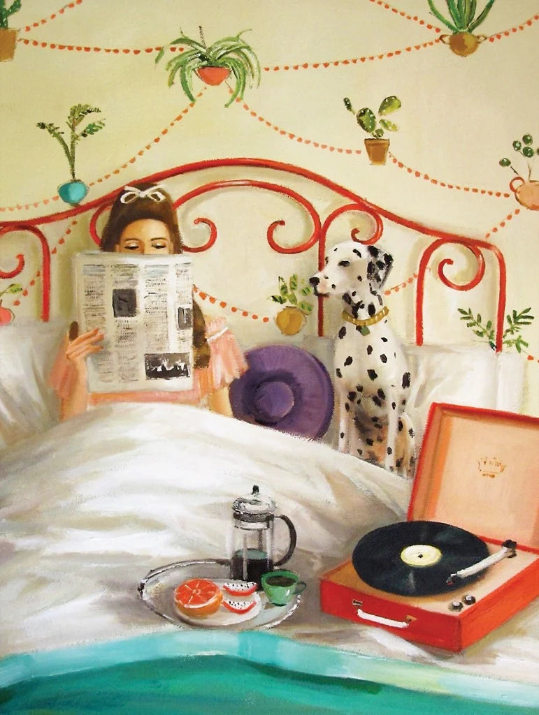 What a perfect morning scene with breakfast, coffee, music, and the news in bed! And don't forget your furry best friend to keep you company!