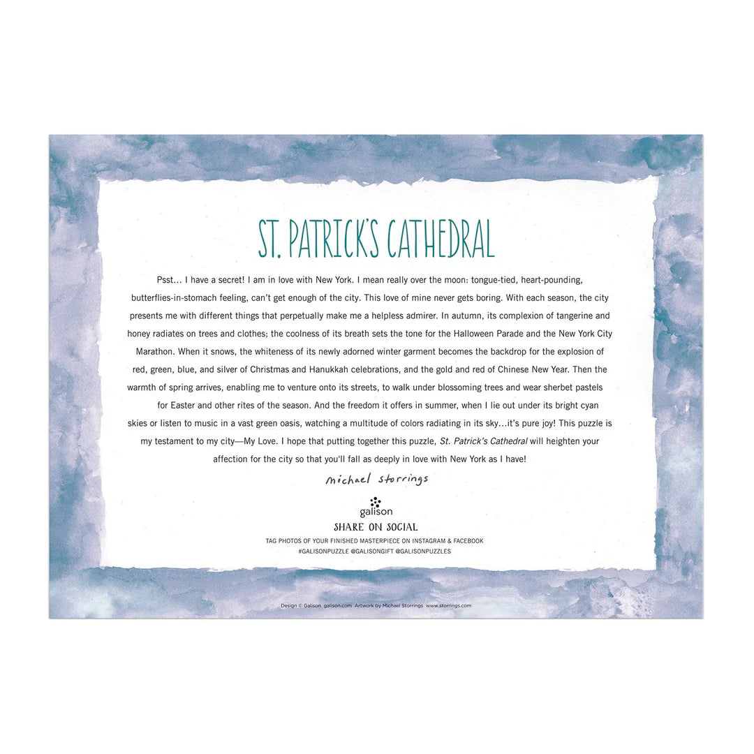 Award-winning designer, illustrator, and creative director Michael Storrings captures the iconic Catholic church and New York City landmark, St. Patricks Cathedral. Galison puzzles are packaged in matte-finish sturdy boxes, perfect for gifting, reuse, and storage. An insert of the full puzzle image is also included.
