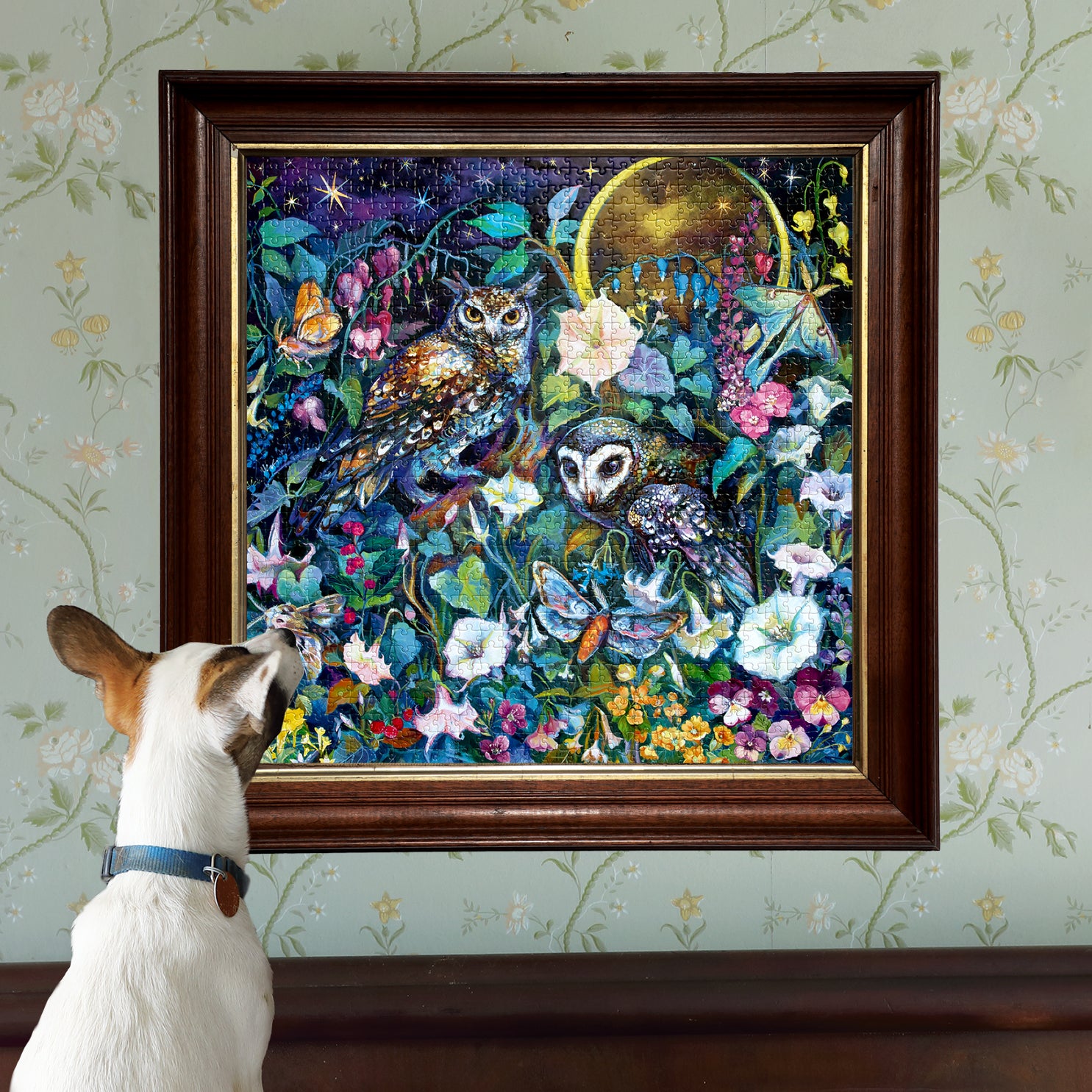 Artist Clara McAllister imagines a pair of owls conferring in a gleaming moonlit garden full of broad leaves and blossoms.