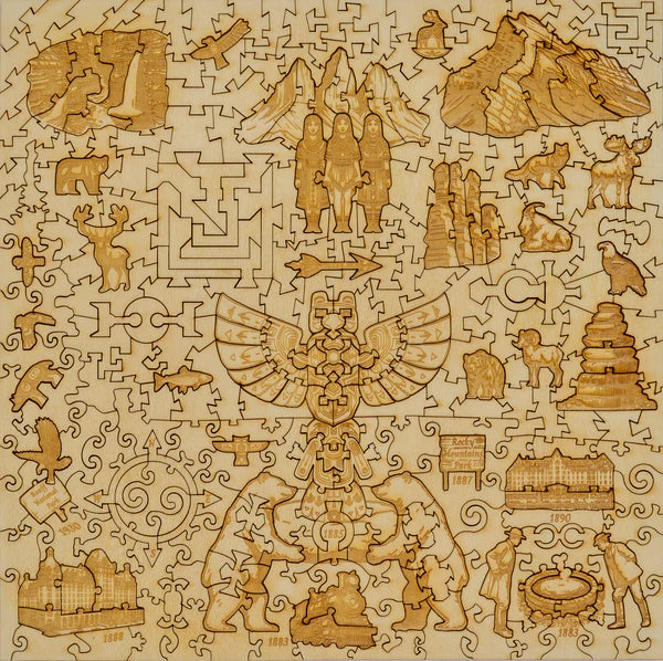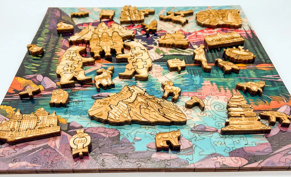Flip the puzzle to discover the storied past of Banff National Park, beautifully depicted on the back side. This narrative-rich panorama traces the park’s evolution from its inception in 1885 after the discovery of thermal springs to its status as a beloved UNESCO World Heritage site. The design intricately blends significant historical milestones with depictions of the park’s flora and fauna, offering a visual journey through time. Each whimsically shaped piece adds a layer of storytelling, illustrating pivotal moments and the diverse ecosystems within the park.