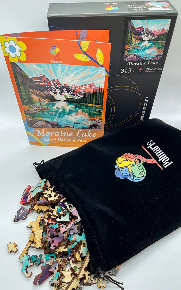 Introducing “Moraine Lake,” a wooden puzzle that showcases the stunning splendor of one of Banff National Park’s most iconic natural landmarks. On the front side of this puzzle, you will piece together the vivid blues and majestic scenery of Moraine Lake, set in the dramatic Valley of the Ten Peaks. The lake’s vibrant, glacially-fed waters and the surrounding rugged peaks capture the essence of the Canadian Rockies’ untouched beauty.
