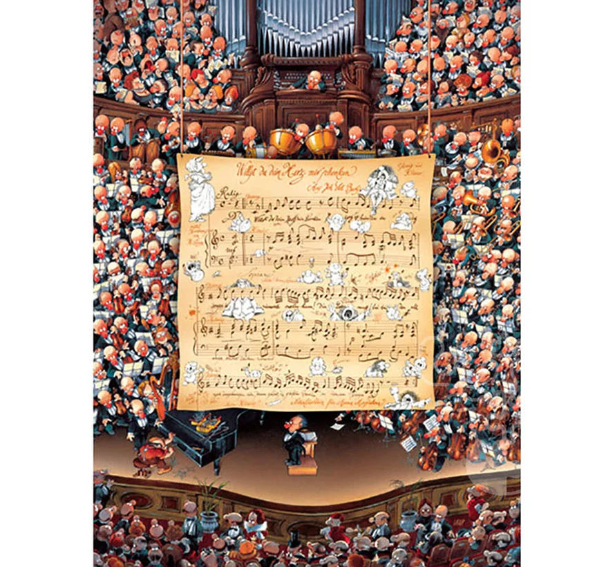Notes from Bach's "Do you want to give your heart to me?" With a wink by Loup in front of a large orchestra - exquisite jigsaw puzzle fun not only for musicians.
