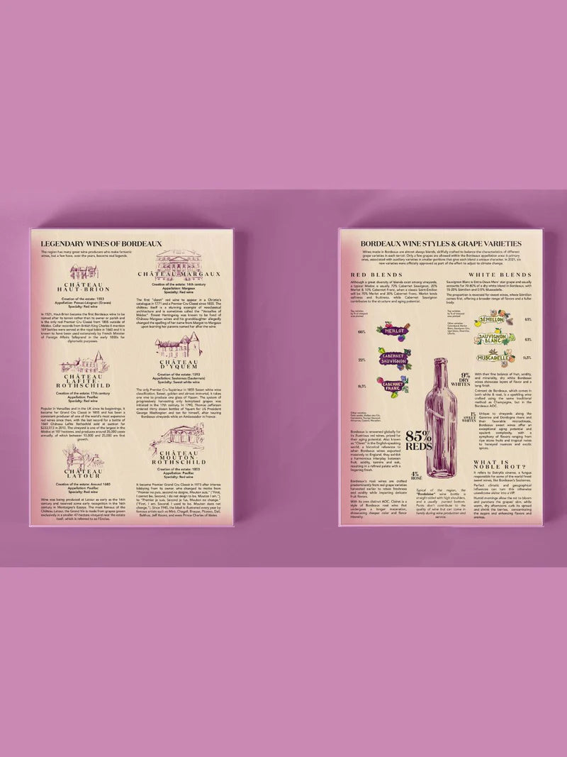 As you unbox the puzzle, you will also find additional information included like a guide to Bordeaux wine labels, a guide to the region's wine styles and grape varieties, as well as the profile of the most legendary châteaux of Bordeaux like Châteaux Margaux or Châteaux Mouton-Rothschild. Get ready to explore the famous Bordeaux and indulge in a puzzling experience like no other!