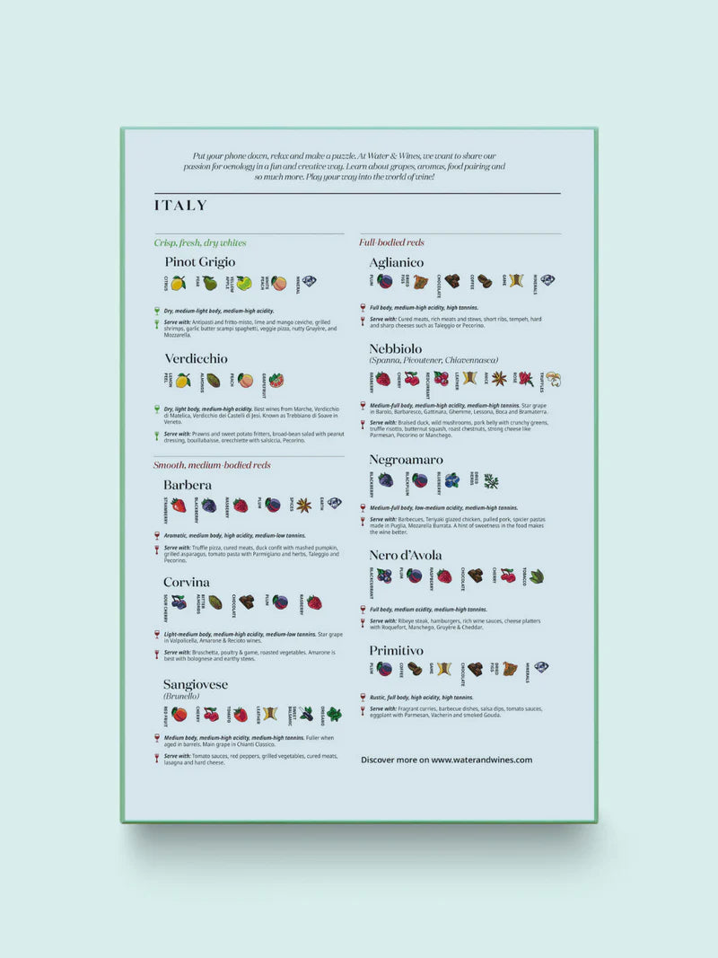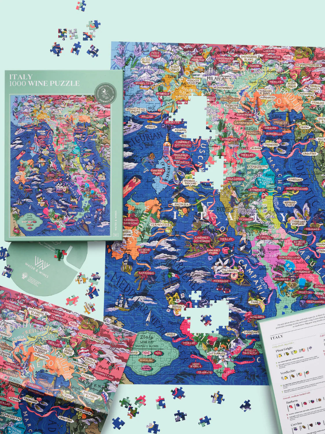 Curated by sommelier experts, the accompanying box features grape profiles of the most famous Italian grapes, complete with food pairing tips so you can savor the true flavors of the Dolce Vita. Get ready to explore the depths of Italian wine culture and indulge in a puzzling experience like no other!